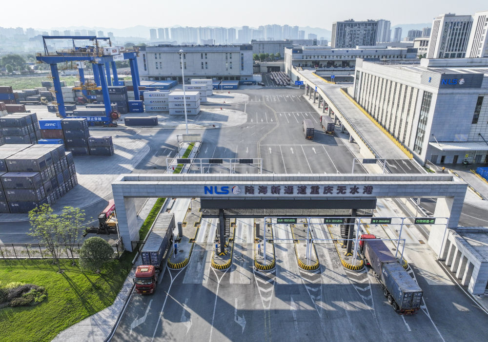 10月28日,轉(zhuǎn)運(yùn)卡車在陸海新通道重慶無(wú)水港來(lái)往穿梭(無(wú)人機(jī)照片)。