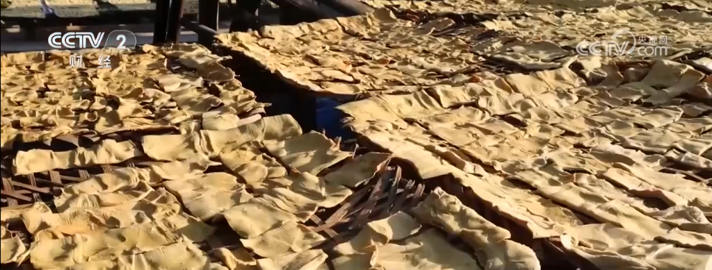 記者走進(jìn)田林縣六隆鎮(zhèn)就聞到濃濃的筍香。經(jīng)過(guò)幾個(gè)月的自然發(fā)酵,扁平、泛白的八渡筍被村民從筍倉(cāng)中取出,在陽(yáng)光下自然晾曬,各家房前屋后鋪滿(mǎn)了金燦燦的八渡筍筍干。