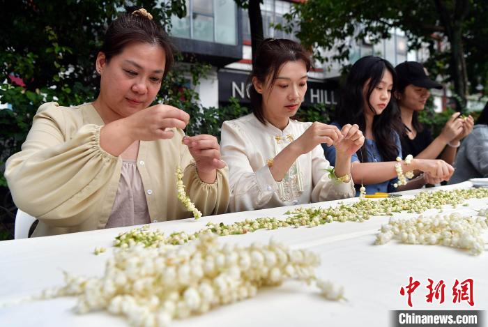 30日,臺胞郭怡君(左一)和榕臺職工一起進(jìn)行茉莉花手環(huán)制作。 中新社記者 張斌 攝