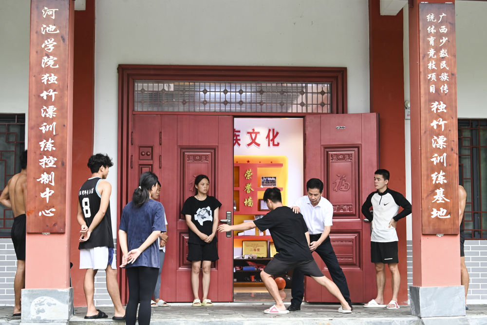 6月19日,河池學(xué)院體育學(xué)院院長(zhǎng)藍(lán)建卓(右二)在糾正獨(dú)竹漂隊(duì)隊(duì)員的動(dòng)作。