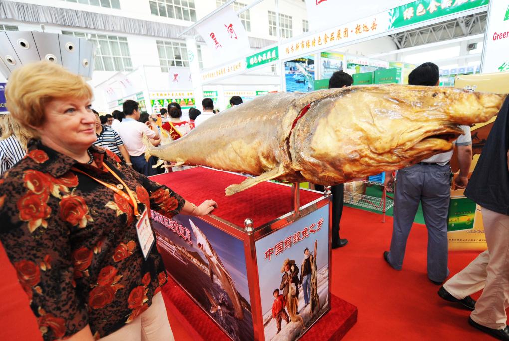 2008年6月15日,在第19屆中國(guó)哈爾濱國(guó)際經(jīng)濟(jì)貿(mào)易洽談會(huì)(后與中國(guó)-俄羅斯博覽會(huì)合并舉辦)上,一位客商在鱘鰉魚(yú)標(biāo)本旁留影。新華社記者 王建威 攝