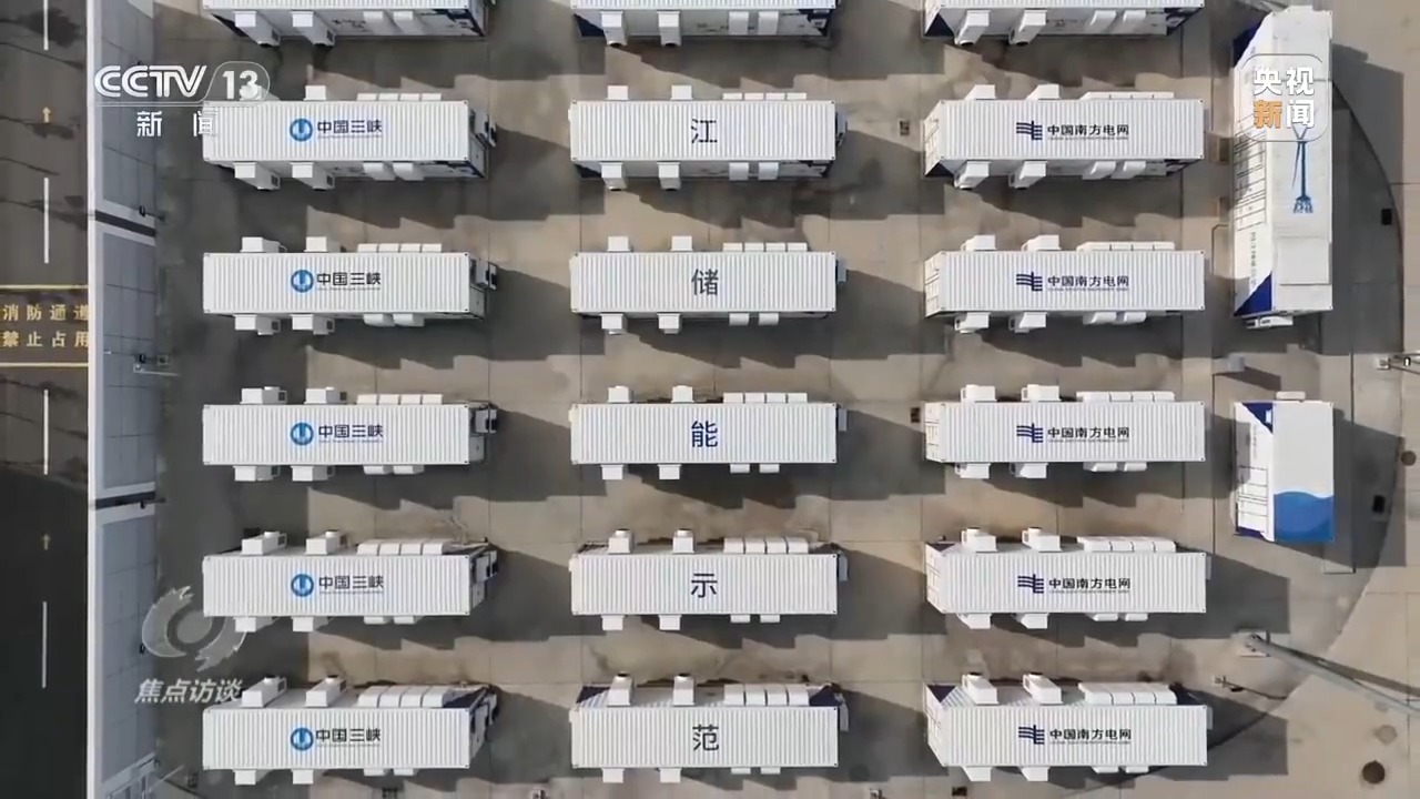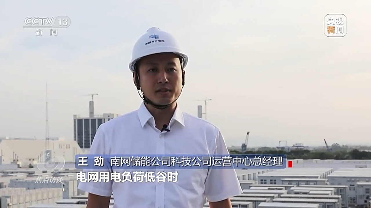 南網(wǎng)儲能公司科技公司運營中心總經(jīng)理 王勁:電網(wǎng)用電負荷低谷時,把電廠發(fā)出的多余的電儲存到250個電池儲能柜內(nèi),用電高峰時,把電池儲能柜里的電能釋放出來支持電網(wǎng)的電力供應。