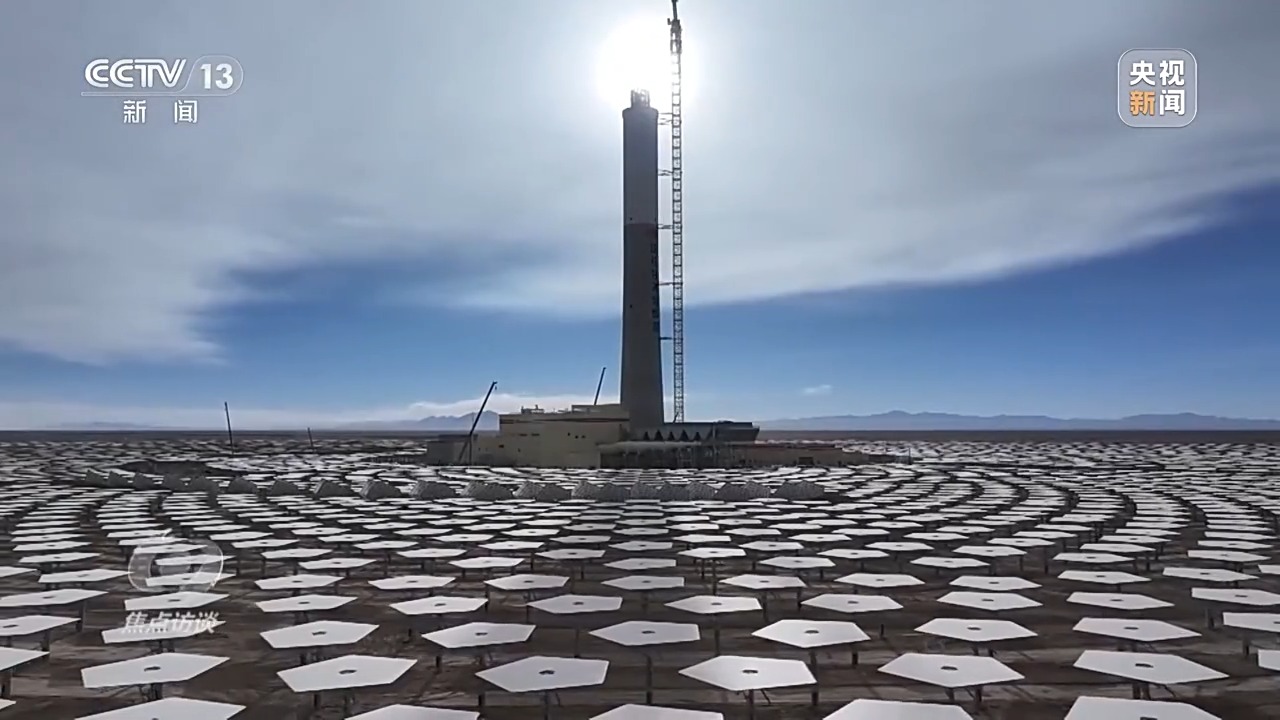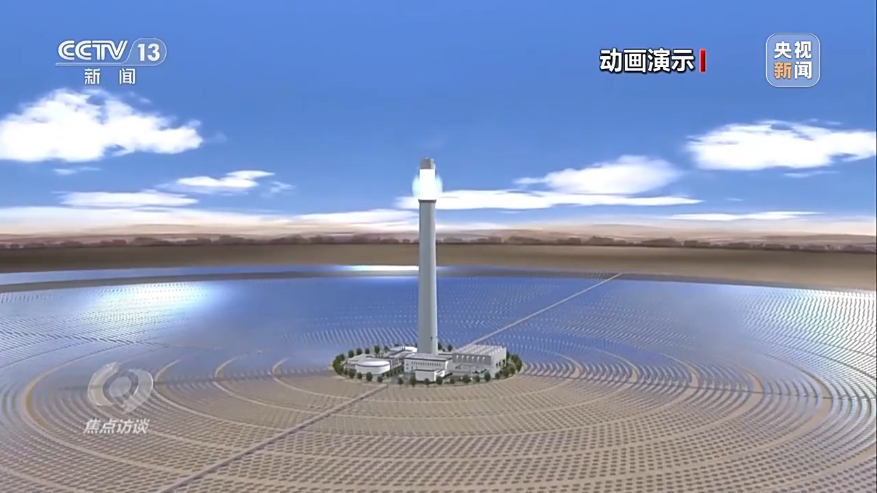 電站通過高精度智能定日鏡,實時跟蹤太陽的運動,將太陽直接輻射光反射聚集到吸熱塔上,將吸熱塔內(nèi)的熔鹽加熱到560多℃的高溫,將高溫的熔鹽進行儲存,在需要發(fā)電時再通過高溫熔鹽與水進行熱交換,產(chǎn)生高溫高壓的蒸汽,驅動汽輪發(fā)電機組發(fā)電。