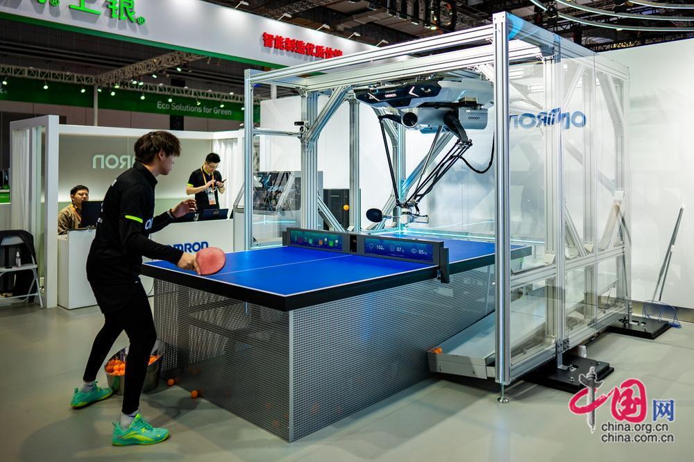 乒乓球教練機(jī)器人打球。中國網(wǎng)記者