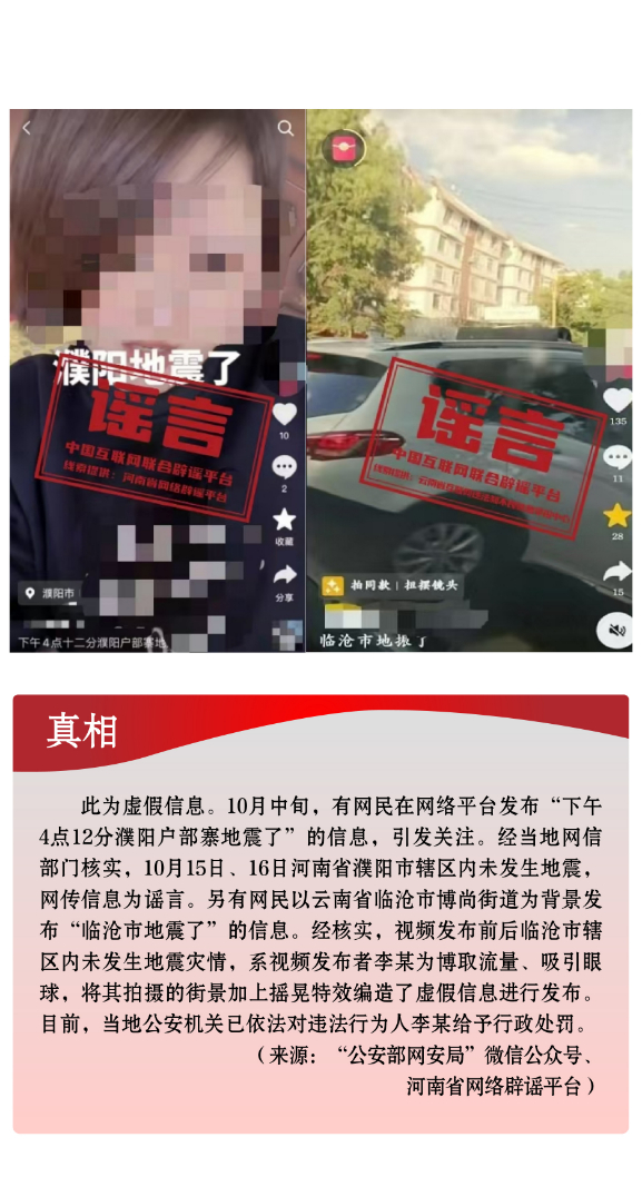 危言聳聽炒作話題。個別網民和自媒體編造虛假信息,炒作社會熱點話題,并配以具有煽動性、誤導性的標題,擴散傳播,擾亂社會秩序。10月中旬,新疆喀什、阿克蘇地區(qū)相繼發(fā)生地震,部分自媒體罔顧事實,利用AI技術拼湊網絡舊圖,編造完全與事實不符的地震廢墟或災后救援圖片,混淆視聽,嚴重誤導網民。另有個別網民將拍攝的街景加上搖晃特效,惡意杜撰云南發(fā)生地震,引發(fā)公眾恐慌,造成不良影響。還有網民為給網店營銷引流,利用家長們高度關注兒童安全話題的心理,無中生有編造“四川巴中頻繁有青少年失蹤”謠言,引發(fā)公眾焦慮恐慌。