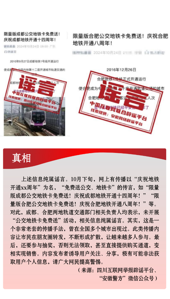 假冒官方虛構政策。一些不法分子冒充權威機構,散布涉公共政策類謠言,誤導公眾認知。有的假借官方名義,偽造政策文件,實則行騙牟利,侵犯群眾利益。如有人利用公眾對“大數據”“數字經濟”等內容的認知盲區(qū),假借“國家數據局”“中國人民銀行數字貨幣研究所”等官方名義,偽造政策文件,謠稱“國家數據局頒發(fā)‘個人數據資產擁有權確權憑證’”“數字人民幣平臺將發(fā)放‘數字資產紅利’”,相關部門均已發(fā)布辟謠聲明。有的從公開發(fā)布的政策信息中摘取碎片化信息,斷章取義,對政策歪曲解讀。如個別自媒體故意混淆“個人養(yǎng)老金”與“基本養(yǎng)老金”的概念,傳播“領取養(yǎng)老金要繳3%個稅”“養(yǎng)老金個稅起征點為5000元”等不實信息,引發(fā)公眾誤解。另有“成都、合肥等地免費送公交地鐵卡”謠言,以“免費”“贈送”為噱頭,誘導用戶關注、分享,最終可能導致用戶遭受個人信息泄露或其他不法侵害。