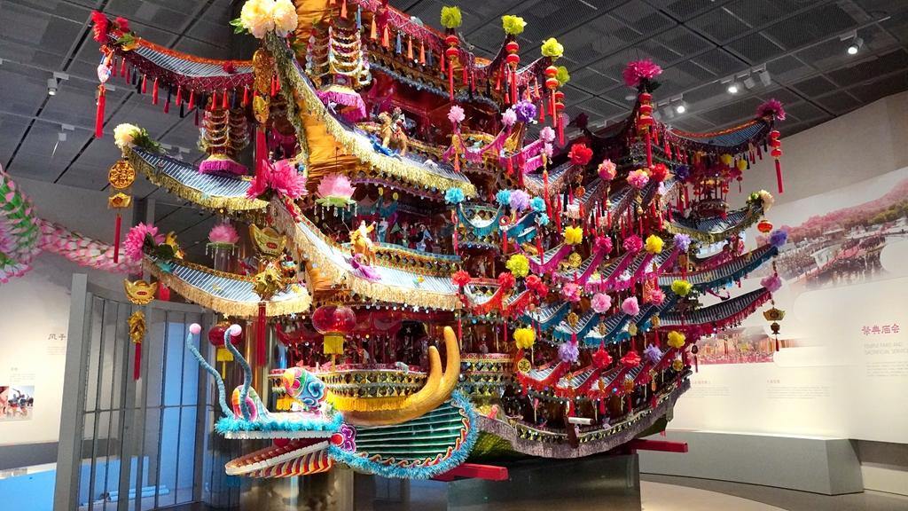 首飾龍,其實(shí)是龍船形狀的花燈,一般長5米,高3米,寬2米。整體為龍的外形,大概由4層樓閣組成,四周貼飾精美絕倫的樂清細(xì)紋刻紙,船身上配有電燈、木雕人偶以及各類裝飾。因?yàn)槭茄灿侮犖橹械拇蝾^,這就是“首”字的由來,而“首飾龍”上有各式各樣的裝飾,這就又有了“飾”字。