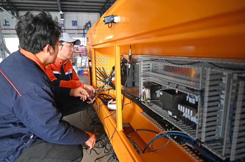 在位于天津市西青區(qū)的天津朗譽機器人有限公司生產(chǎn)車間內(nèi),工作人員在調(diào)試重載自動導(dǎo)引運輸車。新華社記者 趙子碩 攝