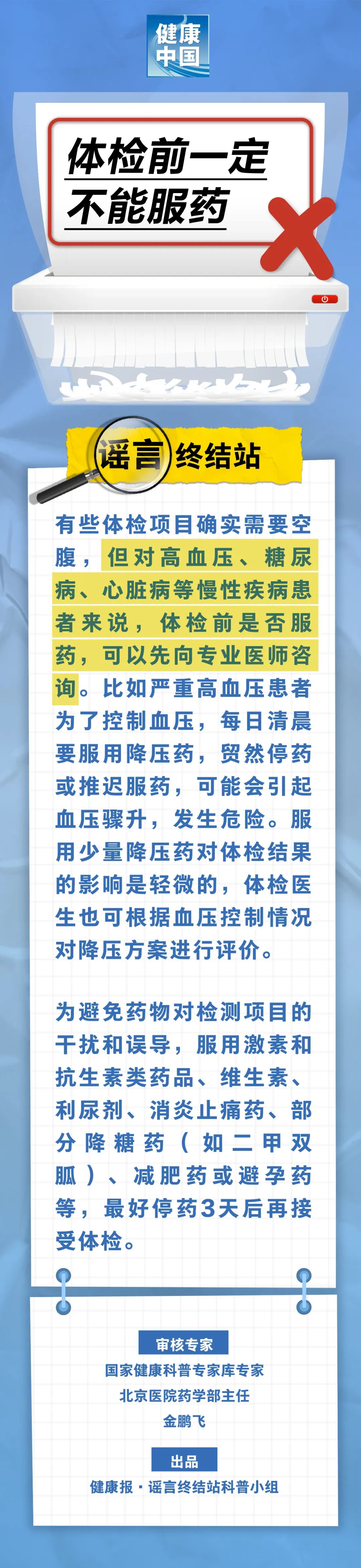 體檢前是否服藥要根據(jù)服用的藥物和檢查目的而定。比如,降壓藥可以按照正常服藥時間服完后再進行體檢,避免造成血壓波動過大,還可同時評估降壓藥物的治療效果;而有些需要隨餐服用的降糖藥則不應(yīng)空腹服用,一般建議隨身攜帶降糖藥,待完成空腹項目后進餐時服用,這樣既保證了服藥效果,又檢測了真實的空腹血糖。