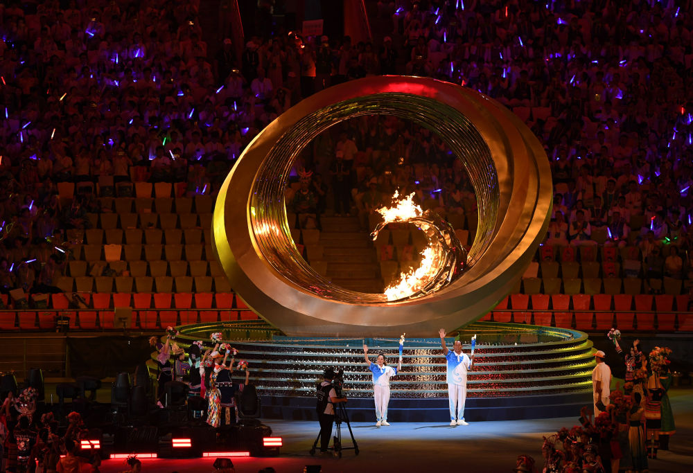 11月22日,火炬手點(diǎn)燃主火炬后。新華社記者 楊文斌 攝