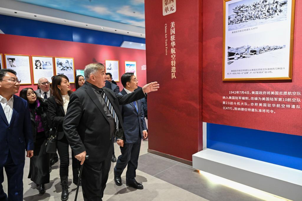 11月30日,美中航空遺產(chǎn)基金會(huì)代表團(tuán)成員在烏魯木齊文化中心展覽館觀看“銘記英雄——飛虎隊(duì)主題歷史圖片展巡展(新疆)”。新華社記者 丁磊 攝