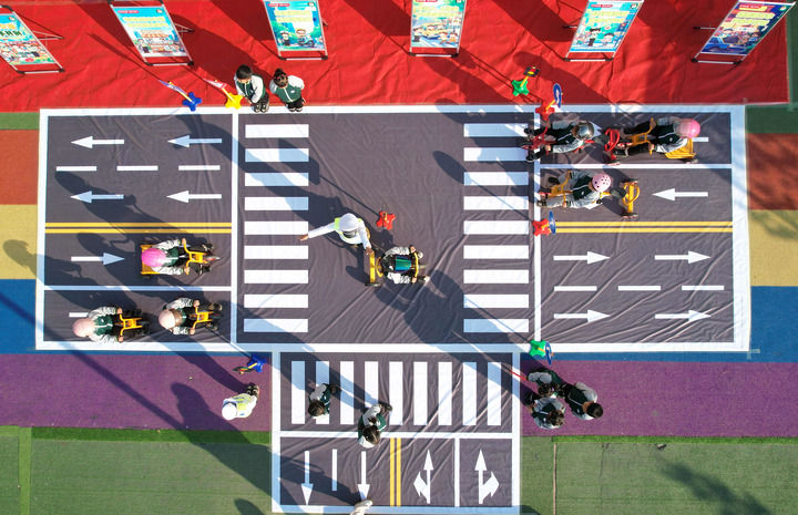 12月1日,在山東省臨沂市沂南縣雙堠鎮(zhèn)中心幼兒園,孩子們通過趣味游戲的方式學習交通知識(無人機照片)。新華社發(fā)(王彥冰攝)