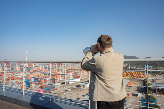 記者們站在觀景平臺(tái),通過望遠(yuǎn)鏡親眼見證了全球最繁忙集裝箱港口之一的現(xiàn)代化作業(yè),他們爭相與壯觀的碼頭場景合影留念。來自哈薩克斯坦《誠實(shí)報(bào)》社會(huì)文化部主任納烏雷茲別克·薩爾沙耶夫在接受環(huán)球網(wǎng)記者采訪時(shí)說道“寧波舟山港的運(yùn)作效率和智能化管理令人贊嘆,它無疑是全球物流行業(yè)的標(biāo)桿?!?/p>