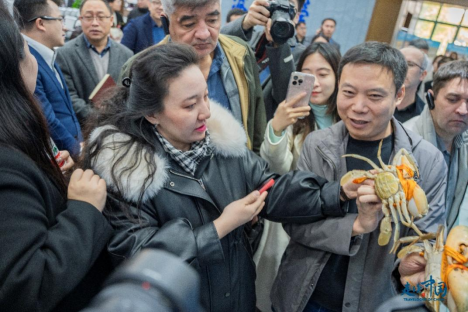 外國記者一邊查看青蟹一邊密集提問