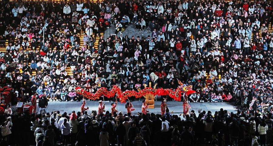 2024年2月12日,游客在山東省臨沂市郯城縣郯國(guó)古城景區(qū)觀看舞龍表演。 新華社發(fā)(張春雷 攝)
