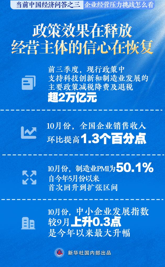 10月份,全國企業(yè)銷售收入同比增長,環(huán)比提高1.3個百分點;制造業(yè)PMI為50.1%,自今年5月份以來首次回升到擴張區(qū)間;非制造業(yè)商務活動指數連續(xù)數月穩(wěn)定在50%左右;中小企業(yè)發(fā)展指數較9月上升0.3點,是今年以來最大升幅。