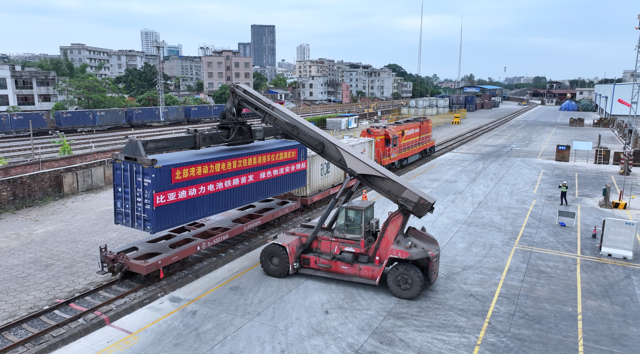11月19日,一列載著比亞迪新能源動(dòng)力鋰電池的列車,從重慶長壽區(qū)渝巴專用鐵路發(fā)車,沿著西部陸海新通道南下,于22日駛?cè)霃V西北部灣防城港新宏光鐵路專用線。隨著接卡作業(yè)的完成,全國首次鐵路發(fā)運(yùn)動(dòng)力鋰電池在北部灣港順利接卸。