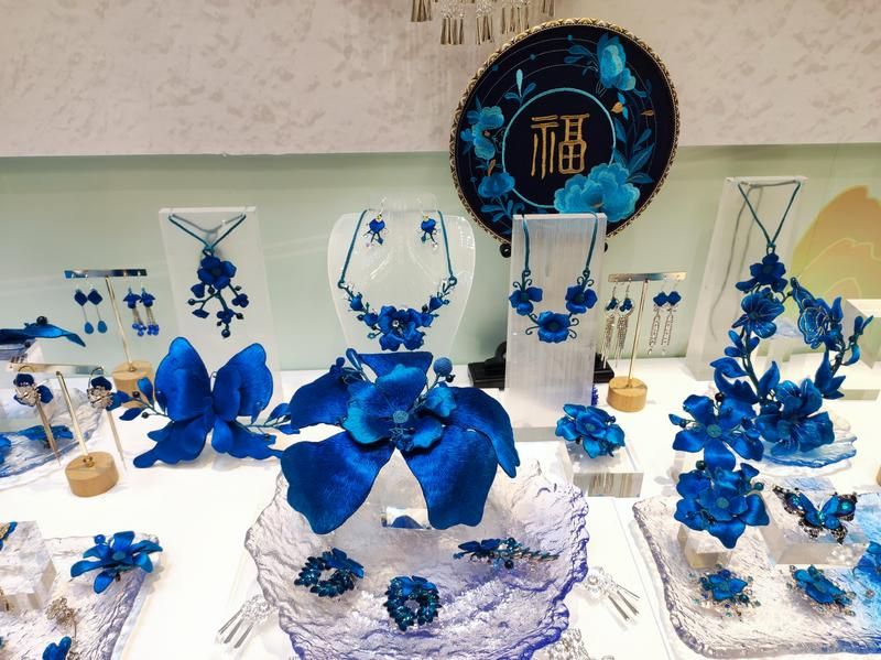 酉州苗繡非遺工坊的“藍色系列”首飾。中青報·中青網(wǎng)記者 蔣肖斌/攝