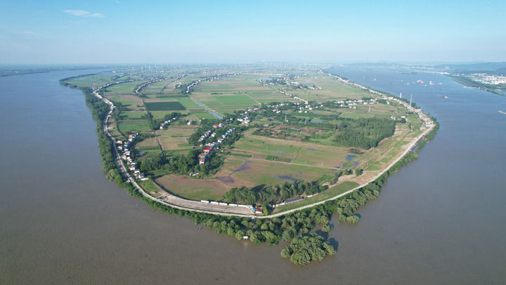 從江西省九江市江新洲洲頭鳥(niǎo)瞰江新洲(2024年7月4日攝,無(wú)人機(jī)照片)。