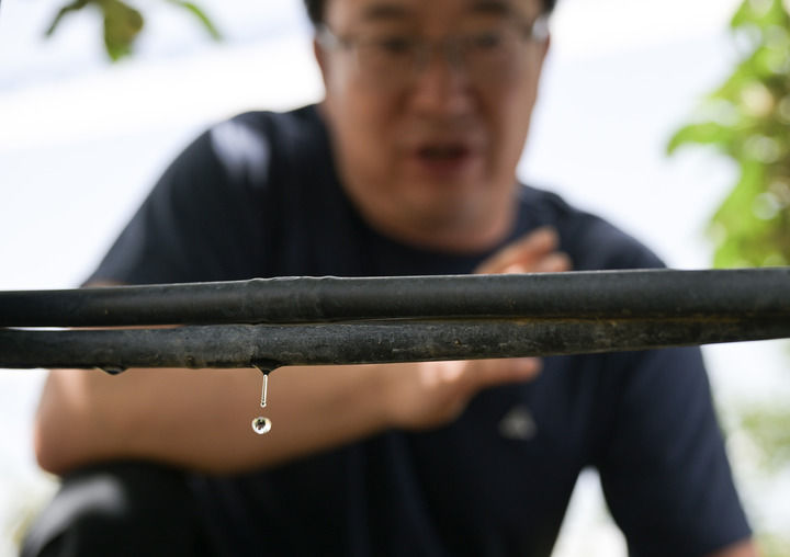 在陜西省延安市洛川縣槐柏鎮(zhèn)度古村“飛天”蘋(píng)果基地灌溉示范點(diǎn),節(jié)水滴灌系統(tǒng)為果樹(shù)灌溉(2024年6月23日攝)。