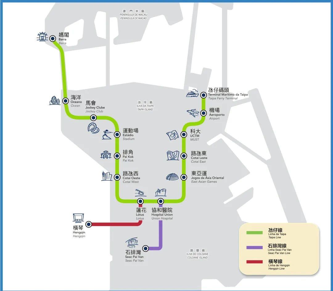 橫琴線全長約2.2公里,設(shè)有蓮花站、橫琴站兩個車站,全程行車時間約2分鐘,班次約6分鐘一班。
