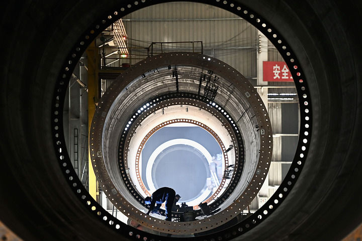 2024年4月23日,新疆木壘哈薩克自治縣民生工業(yè)園區(qū)木壘泰勝風能裝備有限公司工人在生產(chǎn)線上生產(chǎn)風力發(fā)電機塔筒。新華社記者 王菲 攝