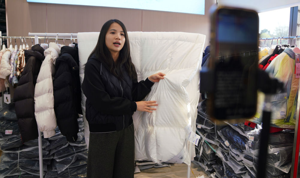 在橋圩羽絨產(chǎn)業(yè)園展示廳,銷售人員正在直播介紹當(dāng)?shù)厣a(chǎn)的羽絨被。新華社記者 楊馳 攝