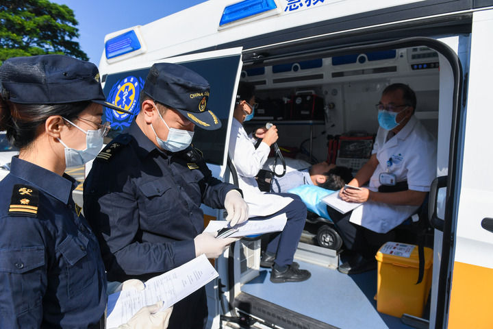 在深圳灣口岸深圳一側(cè),海關(guān)工作人員對(duì)參加第二次粵港跨境直通救護(hù)車(chē)演練的救護(hù)車(chē)進(jìn)行出境前的查驗(yàn)(2024年10月31日攝)。新華社記者 毛思倩 攝
