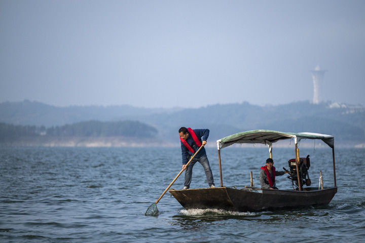 湖北丹江口市清漂隊隊長楊力(左)和清漂隊隊員在丹江口水庫進行清漂作業(yè)(2024年10月28日攝)。新華社記者 伍志尊 攝