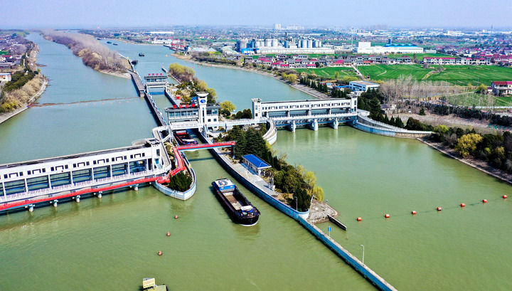位于江蘇省揚州市江都區(qū)的南水北調(diào)東線一期工程運鹽閘、邵仙套閘、邵仙閘洞(2024年3月19日攝,無人機照片)。新華社發(fā)(任飛攝)