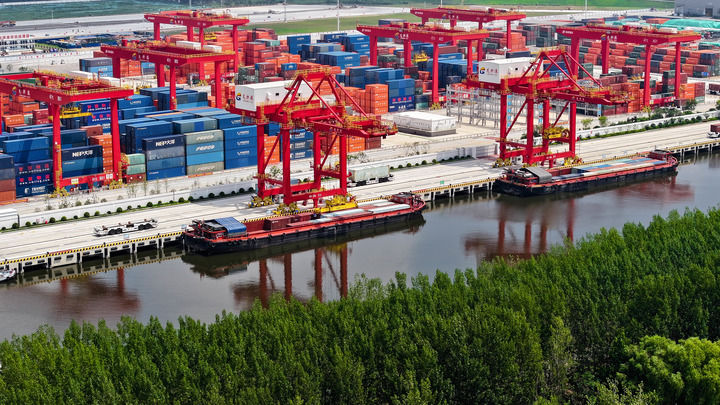 在位于京杭大運河上的山東省濟寧港航龍拱港,貨船在裝運集裝箱(2024年8月3日攝,無人機照片)。新華社記者 郭緒雷 攝