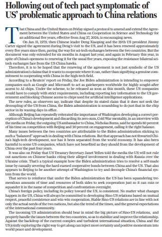 協(xié)定原定于2023年8月再次續(xù)簽,盡管中方對按慣例續(xù)簽5年始終表示歡迎態(tài)度,但當(dāng)時協(xié)定只短期延長了6個月,今年2月到期后,又再次延長6個月,這一動向,也暴露出美國對華鷹派對中美間科技交流所持有的反對態(tài)度。