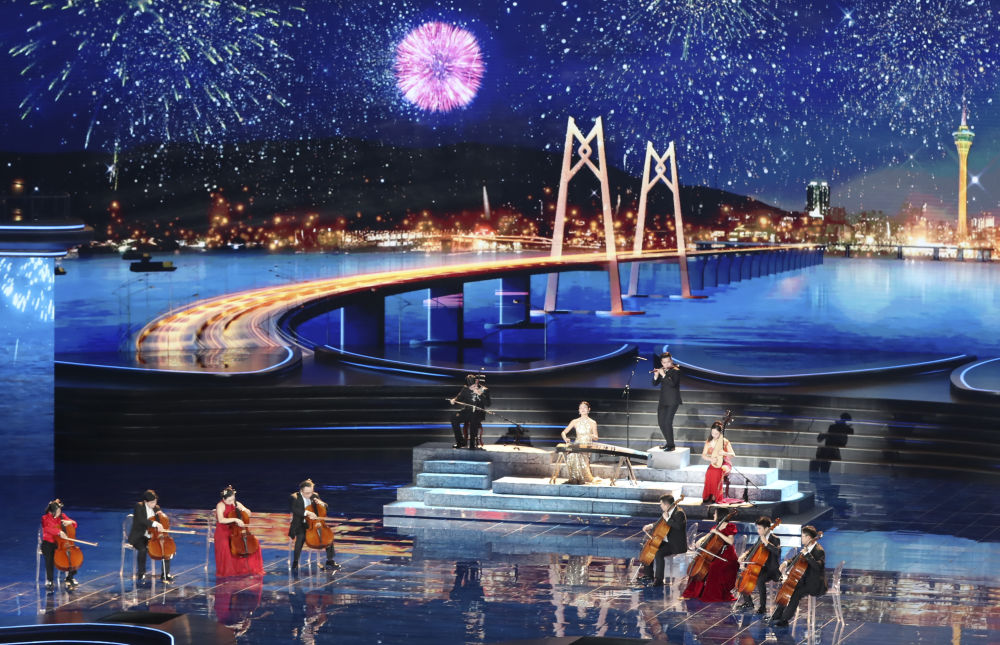 燈光轉(zhuǎn)為蔚藍(lán)。中外樂(lè)器結(jié)合,將古韻奏出新聲,同時(shí)呈現(xiàn)著鏡海新貌,西灣大橋、澳門旅游塔等一個(gè)個(gè)澳門地標(biāo)在屏幕上接連出現(xiàn)。