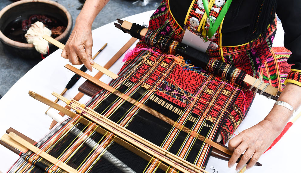 在2023海南錦繡世界文化周非物質(zhì)文化遺產(chǎn)傳統(tǒng)織繡印染技藝項目精品展上,手工藝人在編織黎錦(2023年4月30日攝)。新華社記者 楊冠宇 攝