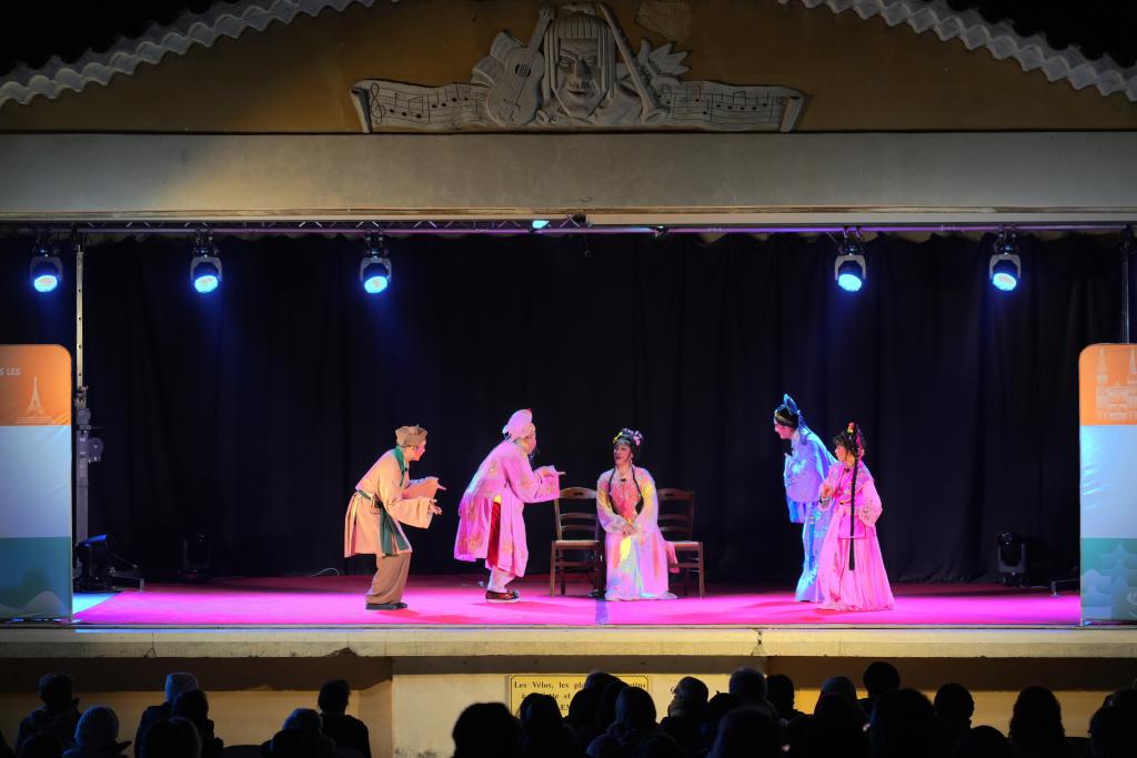 12月17日,在法國(guó)佩爾訥萊方丹,來(lái)自中國(guó)福建展演團(tuán)的演員以高甲戲的形式演繹法國(guó)喜劇作家莫里哀代表作《吝嗇鬼》。(新華社記者 孫鑫晶攝)