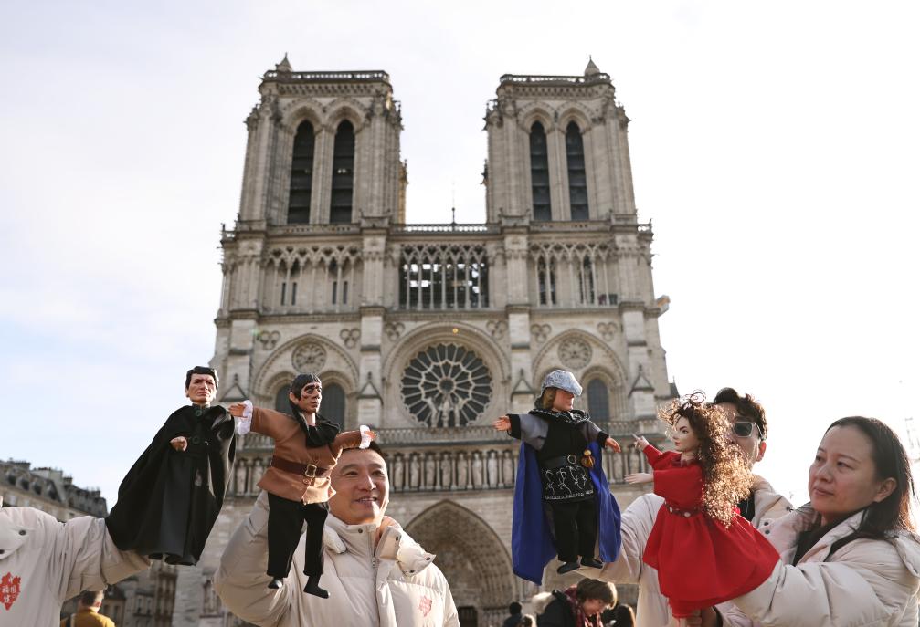 12月15日,在法國(guó)巴黎圣母院前,來(lái)自中國(guó)福建展演團(tuán)的演員表演布袋木偶戲《巴黎圣母院》。(新華社記者 高靜攝)