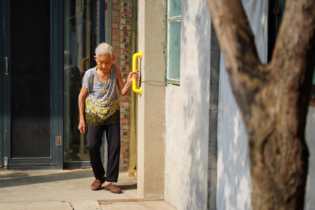 河北省巨鹿縣后辛莊村一位老人扶著適老化改造工程安裝的扶手在院子里行走。 新華社記者牟宇 攝