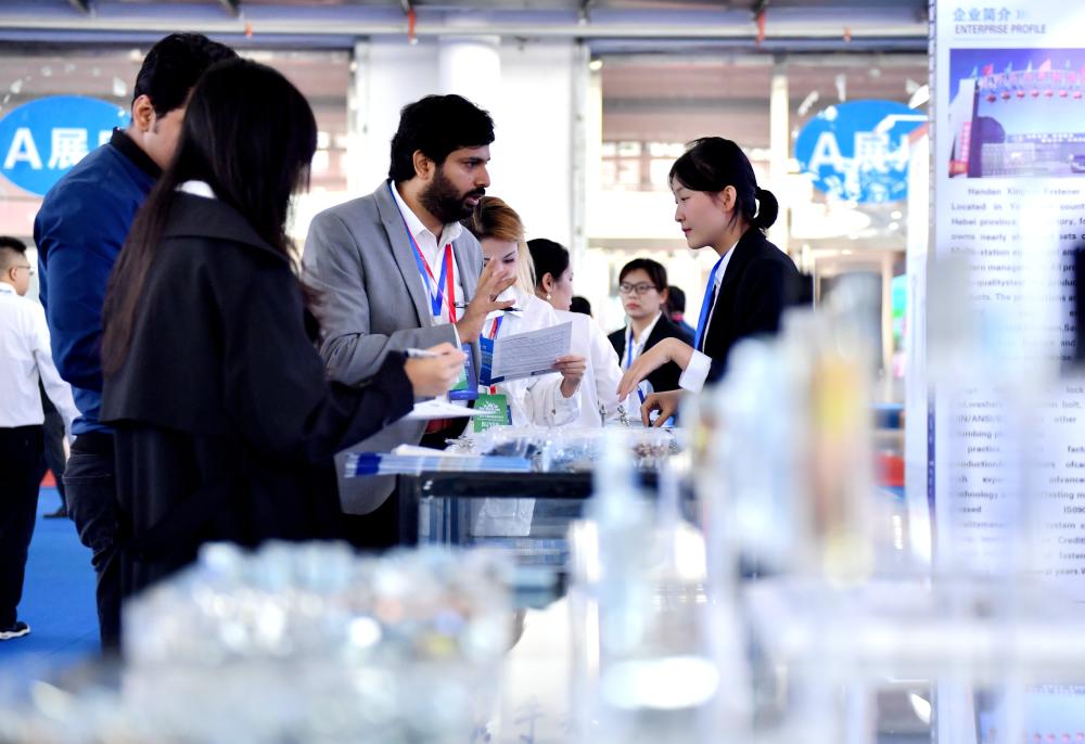 2024年10月10日,采購商(中)在2024年中國·永年緊固件基地國際采購大會(huì)現(xiàn)場(chǎng)了解緊固件產(chǎn)品信息。新華社記者 王曉 攝