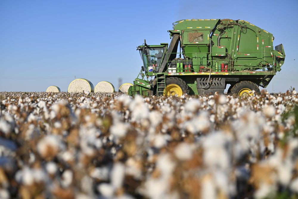 9月29日,采棉機(jī)在新疆生產(chǎn)建設(shè)兵團(tuán)第六師五家渠市的棉田采收棉花。新華社記者胡虎虎 攝