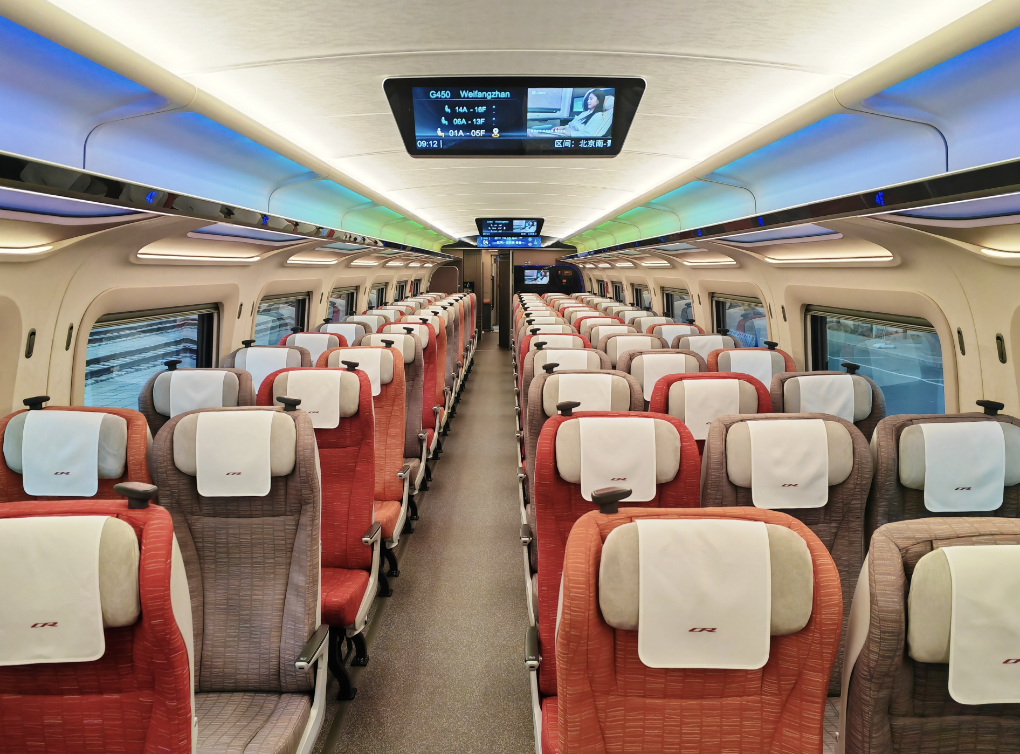車(chē)廂內(nèi)部可隨室外環(huán)境自動(dòng)調(diào)節(jié)亮度;每個(gè)座位都提供USB等充電設(shè)施;可提供多功能間、家庭包間、商務(wù)包間等多樣選擇……CR450動(dòng)車(chē)組讓旅途更舒適。