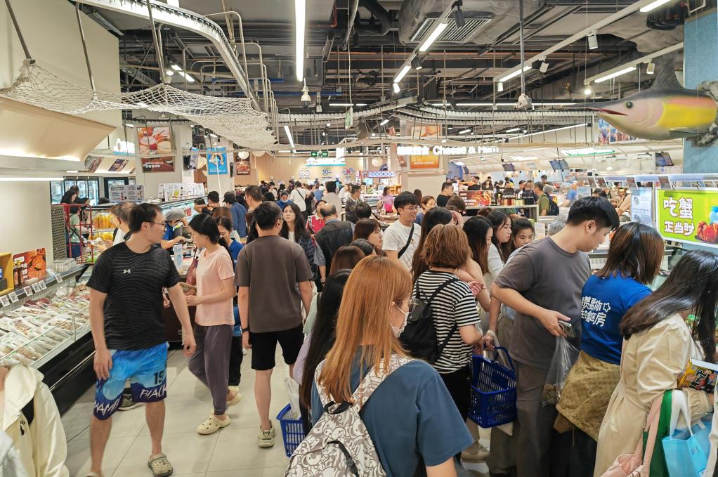 在位于深圳皇庭廣場(chǎng)的盒馬鮮生,眾多游客在購(gòu)物,其中不少來(lái)自香港。新華社記者王豐 攝