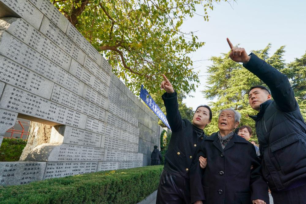 在南京大屠殺死難者家庭祭告活動(dòng)中,艾義英(右二)和家人在侵華日軍南京大屠殺遇難同胞紀(jì)念館的“哭墻”上尋找家人姓名(2024年12月1日攝)。新華社記者 李博 攝