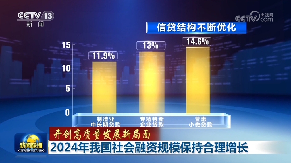 中國人民銀行相關(guān)負(fù)責(zé)人介紹,2024年12月末,社會融資規(guī)模存量為408.34萬億元,其中,對實(shí)體經(jīng)濟(jì)發(fā)放的人民幣貸款余額為252.53萬億元,同比增長7.2%。信貸結(jié)構(gòu)不斷優(yōu)化,制造業(yè)中長期貸款、專精特新企業(yè)貸款、普惠小微貸款增長較快,繼續(xù)高于同期全部貸款增速。