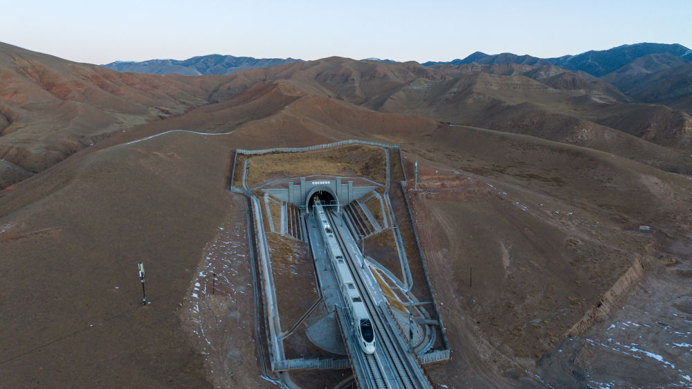 1月14日8時20分許,蘭州西發(fā)往武威東的D8885次動車組列車穿過新烏鞘嶺隧道。這是新烏鞘嶺隧道通車后迎來的首列春運列車(無人機照片)。新華社記者 郎兵兵 攝