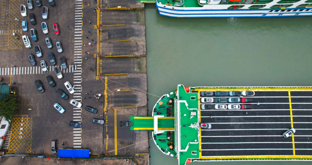1月14日,在海南省海口市秀英港,新能源車排隊(duì)駛?cè)胄履茉窜噷S眠\(yùn)輸船“綠源二號(hào)”(無(wú)人機(jī)照片)。(新華社記者 楊冠宇 攝)
