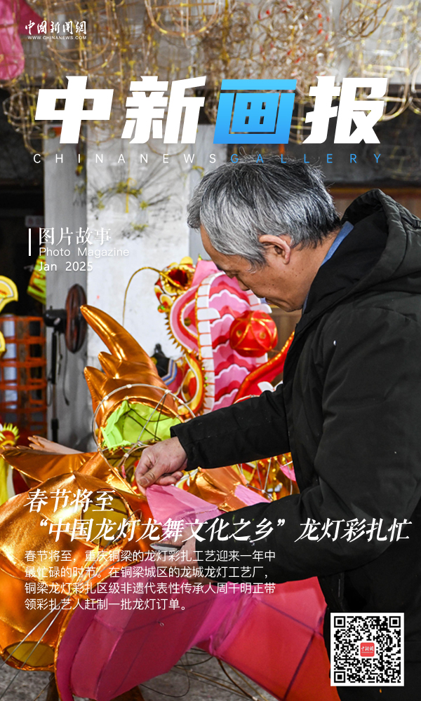重慶銅梁區(qū)被譽為“中國龍燈龍舞文化之鄉(xiāng)”,銅梁龍燈彩扎是當?shù)匾环N以龍文化為主題的燈彩藝術。2021年,銅梁龍燈彩扎被列入國家級非物質文化遺產代表性項目名錄。銅梁龍燈彩扎以竹子和鐵絲為骨架,經過扎制、裱糊、彩繪、整裝等繁復工序,最終呈現(xiàn)出栩栩如生的龍燈形態(tài)。春節(jié)將至,重慶銅梁的龍燈彩扎工藝迎來一年中最忙碌的時節(jié)。在銅梁城區(qū)的龍城龍燈工藝廠,銅梁龍燈彩扎區(qū)級非遺代表性傳承人周千明正帶領彩扎藝人趕制一批龍燈訂單?!坝捎邶垷舨试廊槐A魝鹘y(tǒng)的手工制作技藝,一條長約30米的龍燈,需要五名彩扎藝人花費近一周的時間才能完成。”周千明表示,每一條龍燈不僅是一件藝術品,更是一種文化的象征,其承載了傳統(tǒng)工藝的傳承與發(fā)展。圖為1月14日,周千明在裱糊龍頭。
