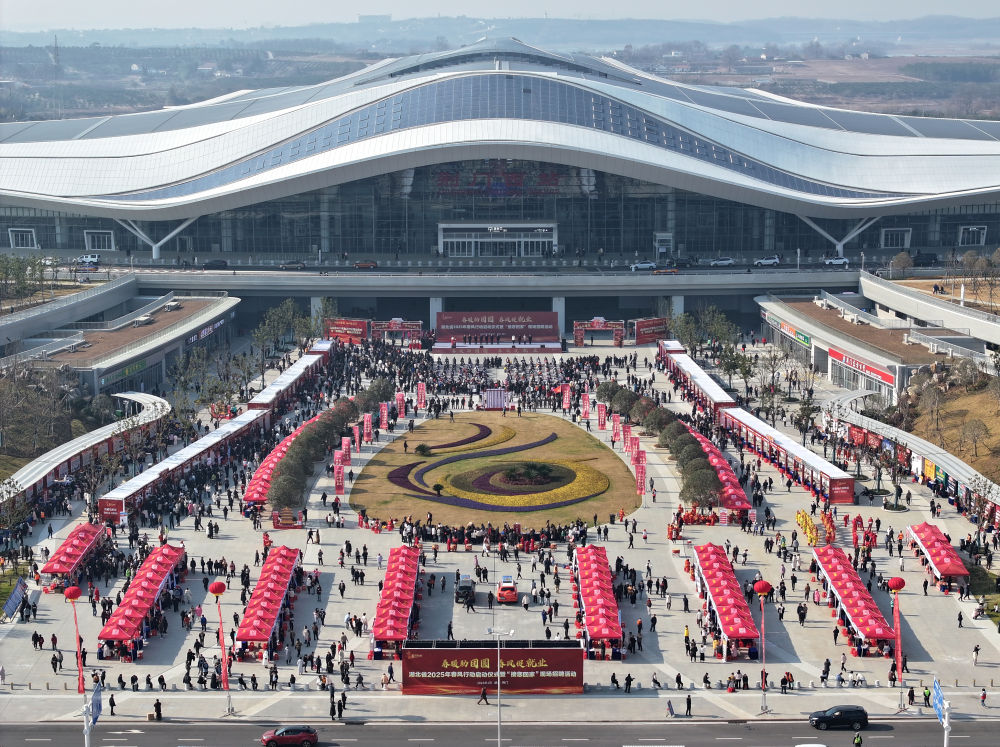 1月12日下午,湖北荊門西站東廣場前,湖北省2025年春風行動啟動儀式暨“接您回家”現(xiàn)場招聘活動舉行。(受訪者供圖)