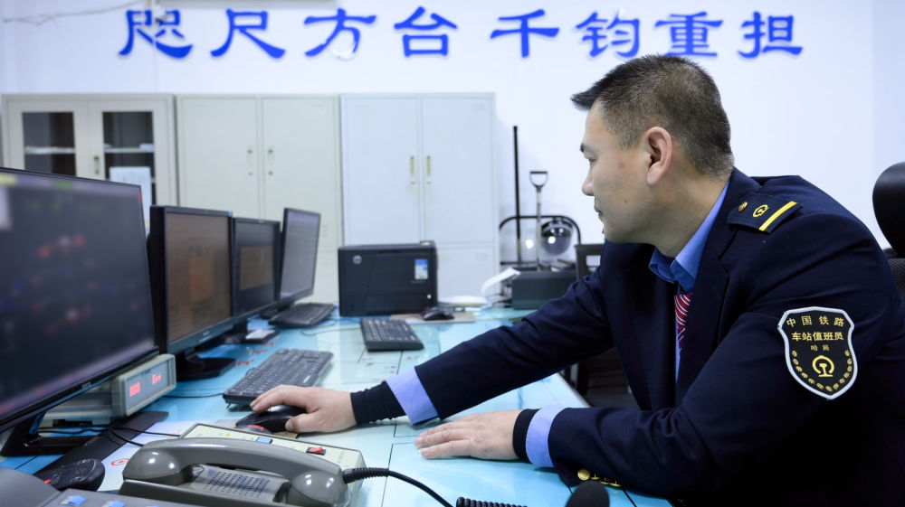 一間不大的值班室,除了床就是操作臺,“咫尺方臺 千鈞重?fù)?dān)”的條幅下,田春緊盯顯示屏。他負(fù)責(zé)運輸組織調(diào)度,是車站“最重要”的崗位。