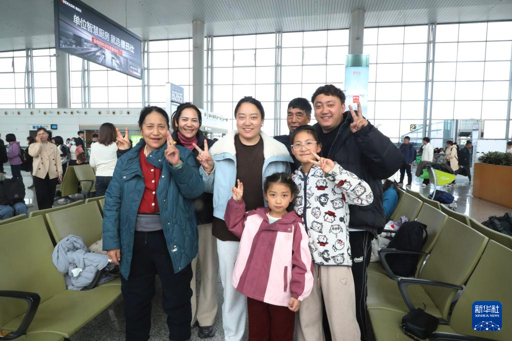 1月14日,斯郎倫珠一家人在廣州白云機場候機時合影。新華社記者 田建川 攝