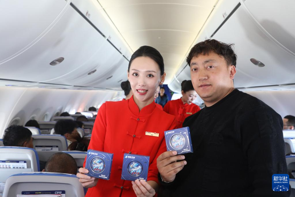 1月14日,斯郎倫珠在南航CZ8233航班上展示空姐為乘客贈送的C919徽章。新華社記者 田建川 攝